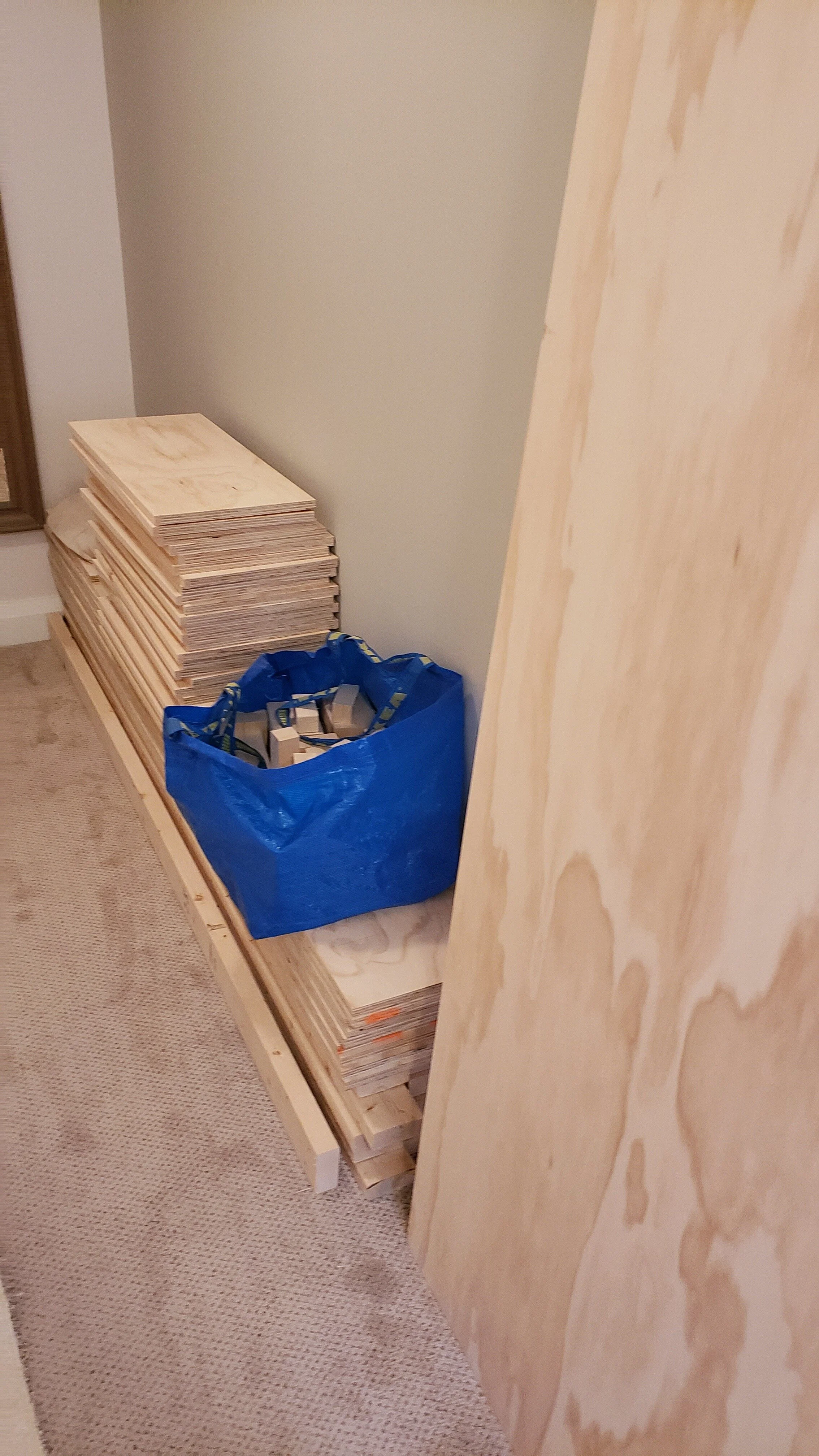The shelves went floor-to-ceiling, and along the entire length of the existing wall. Some additional drywall was installed in order to ‘continue’ the hallway and make the shelves appear to ‘sink’ into the new wall. One electrical outlet was relocated so as to serve as a counter-height charging station. The shelves and uprights were made with 3/4” sanded plywood, with 1/2” hardwood frontage strips for added durability and a cleaner look. The shelves were spaced and supported by a concealed 2x4 framing system, and the whole system was constructed using over 300 wood screws. I counted :-)