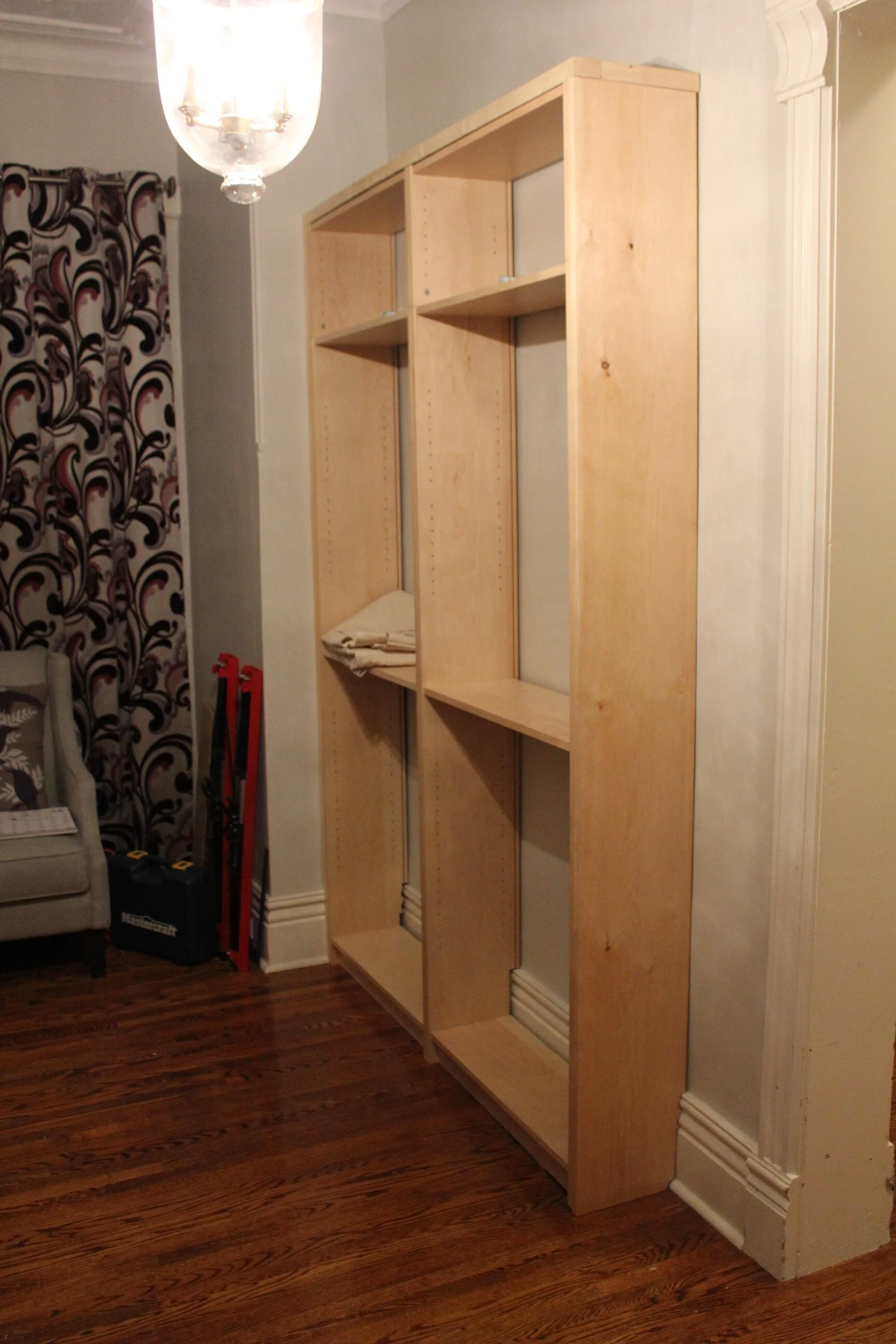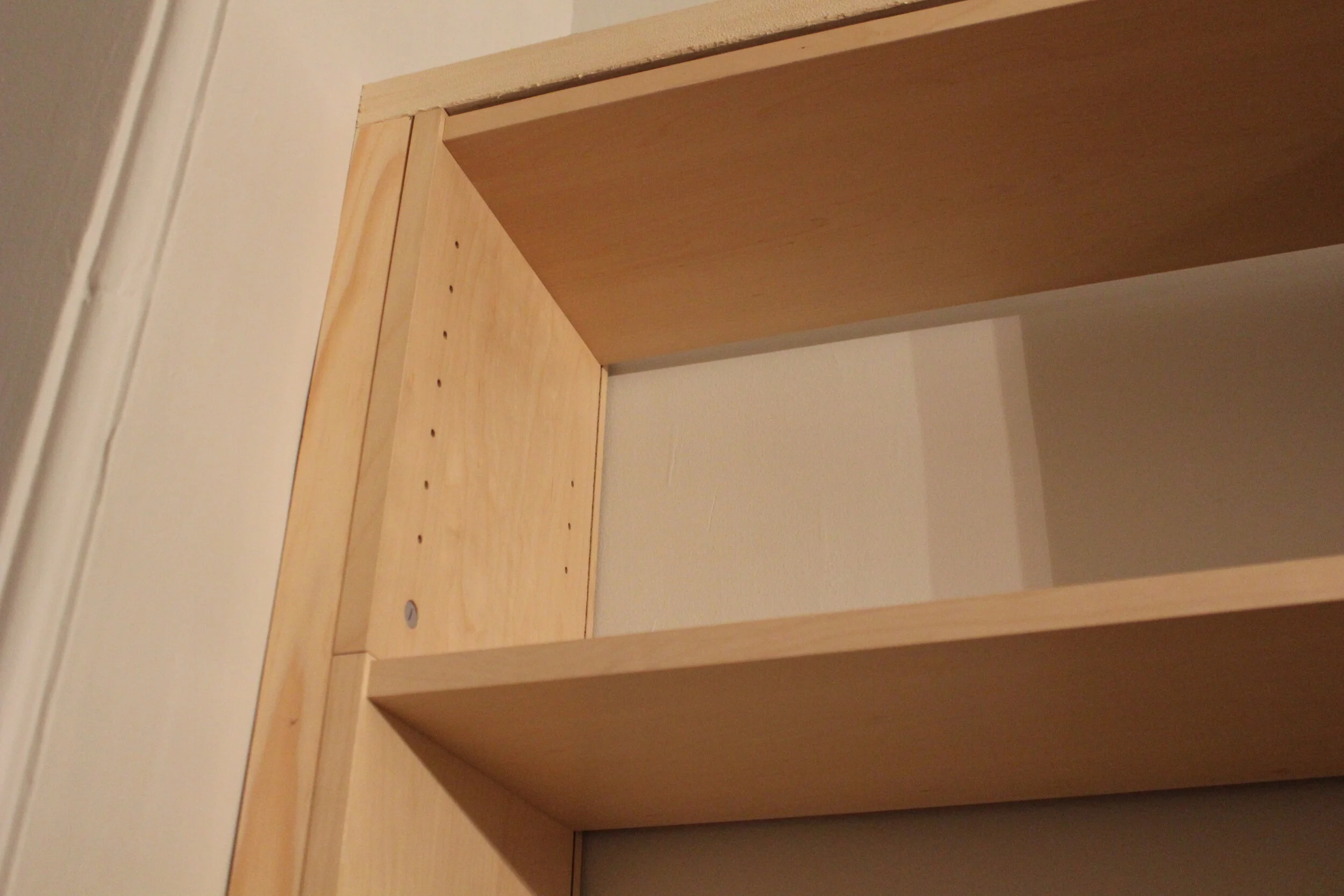 This is a built-in bookshelve made from a pair of IKEA Billy bookshelves. We hacked the appearance with additional trim and fill, so that they looked as though they were built-in originals, and had been in place for many years.